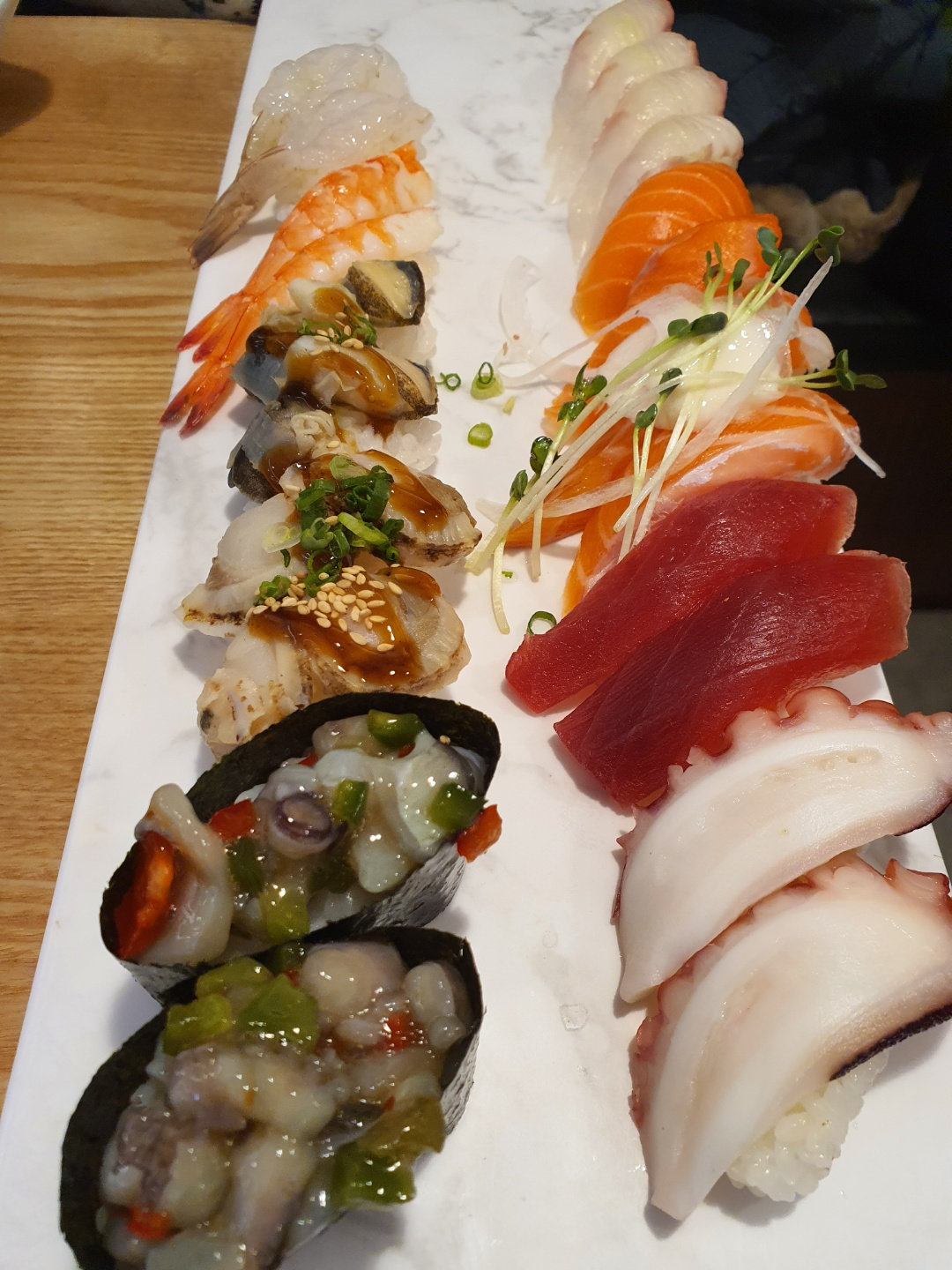 사진에 나온 초밥과 미니우동 2개, 새우튀김 2개와 함께 가격은 35,000원이었다.