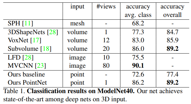 기존 방법론의 경우 Point Cloud를 image로 변환하거나 여러 view 를 사용해서 전처리를 진행한 후 진행했지만, PointNet의 경우 input을 그대로 사용했음에도 성능이 우수한 것을 확인할 수 있음