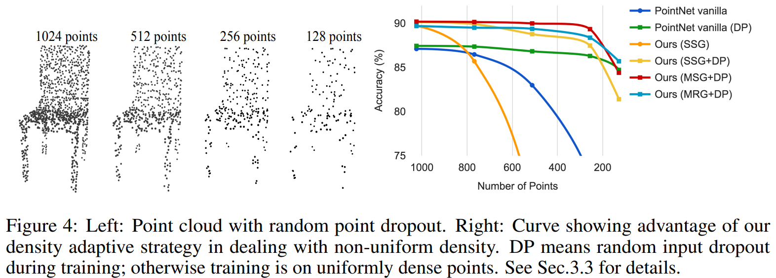 - non uniform point sampling 이슈를 다루기 위해 density adaptive strategy( MSG, MRG)를 제안