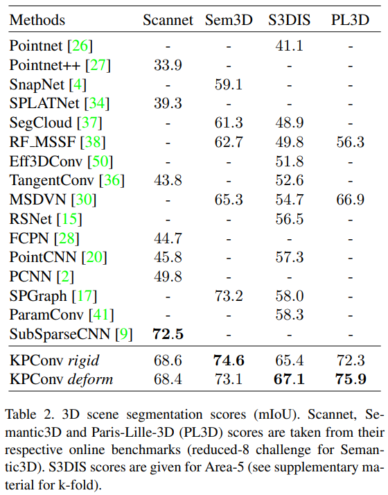 KPConv는 rigid/deformable KPConv로 나뉘고, 다양한 데이터 셋에서 대체적으로 좋은 성능을 보임.
