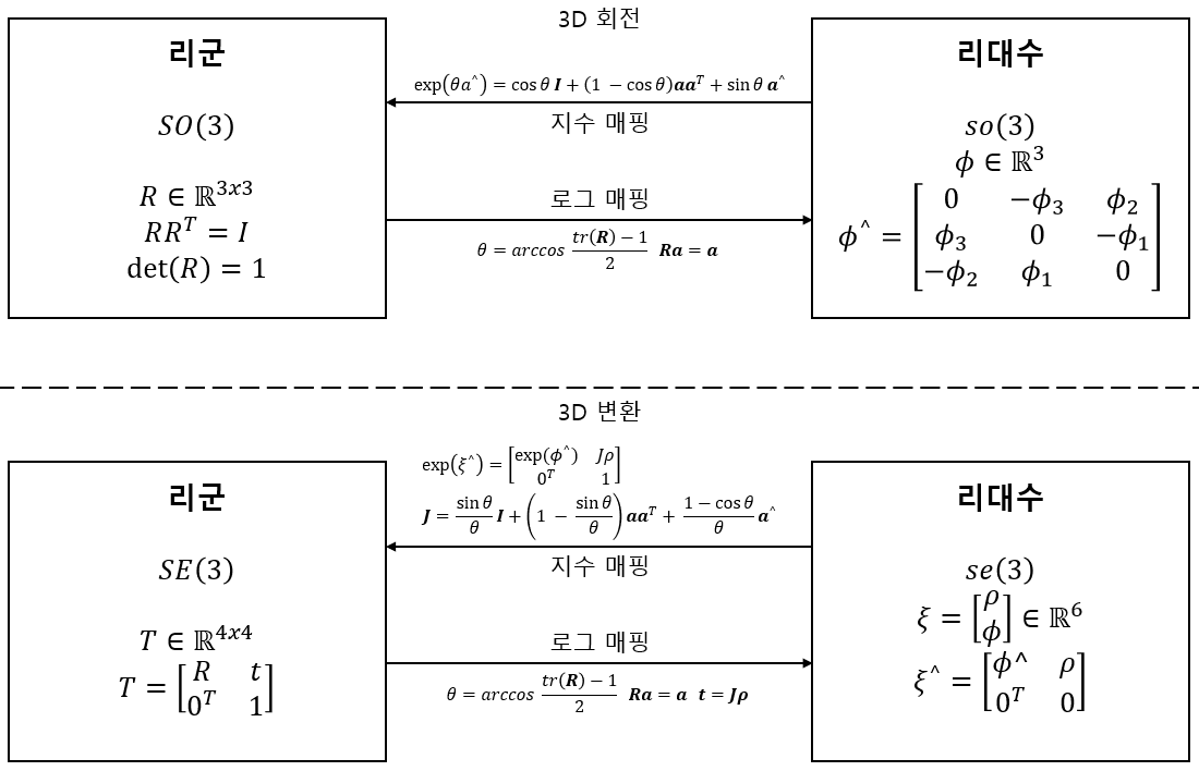 3. SLAM에서 리 군(SO(3), SE(3), Sim(3))과 리 대수(so(3), se(3), sim(3))는 지수 매핑과 로그 매핑을 통해 변환이 가능하다.